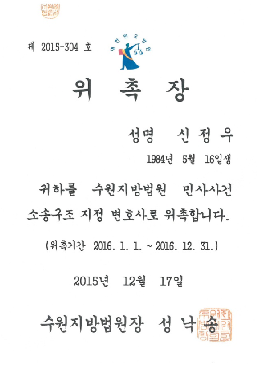* 신정우변호사님, 이경렬변호사님 수원지방법원 민사사건 소송구조 지정 변호사 위촉 2016-01-13 법률사무소 고운 신정우, 이경렬, 고석원 변호사님께서 2016. 1. 1. 부터 2016. 12. 31. 까지 수원지방법원 민사사건 소송구조 지정 변호사로 활동하게 되었습니다. 이전글 * 주식회사 아스트로텍과 고문계약 체결 다음글 * 조철현변호사님, 김민정 변호사님 경기도 법률상담위원 위촉 목록 보기