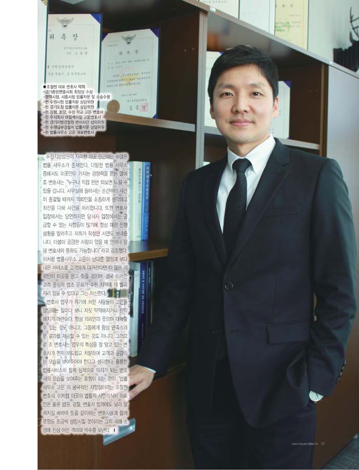 * 조철현 대표변호사님 2016 우수법률가 부분 대상 수상(이슈메이커 선정) 2016-01-25 이전글 * 조철현변호사님, 김민정 변호사님 경기도 법률상담위원 위촉 다음글 * 조철현변호사님, 이경렬변호사님 수원시청 고문 변호사 위촉 목록 보기