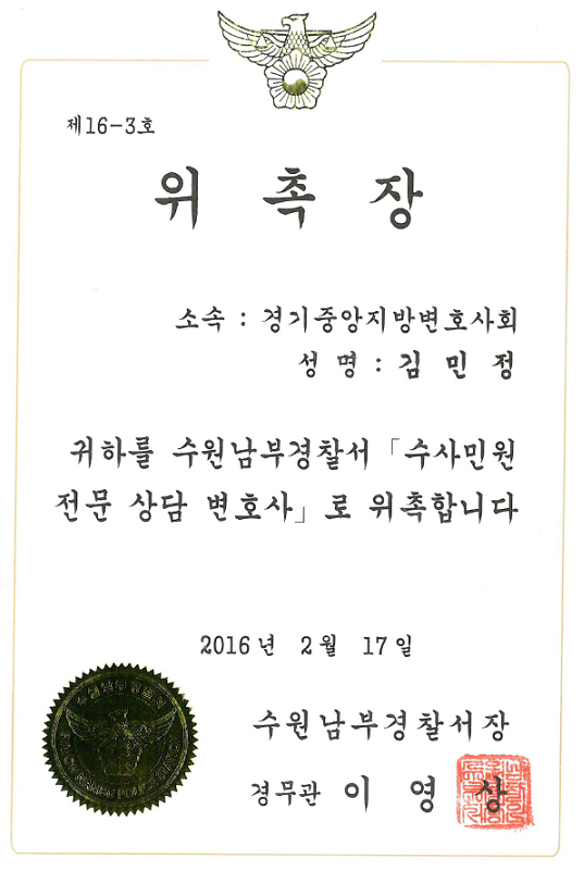 조철현 대표변호사님이 작년부터 수원남부경찰서 법률자문 상담위원이 되신 것에 이어 이번에 김민정 변호사님이 수원남부경찰서 「수사민원 전문상담변호사」로 선정되어 활동하시게 되었습니다.