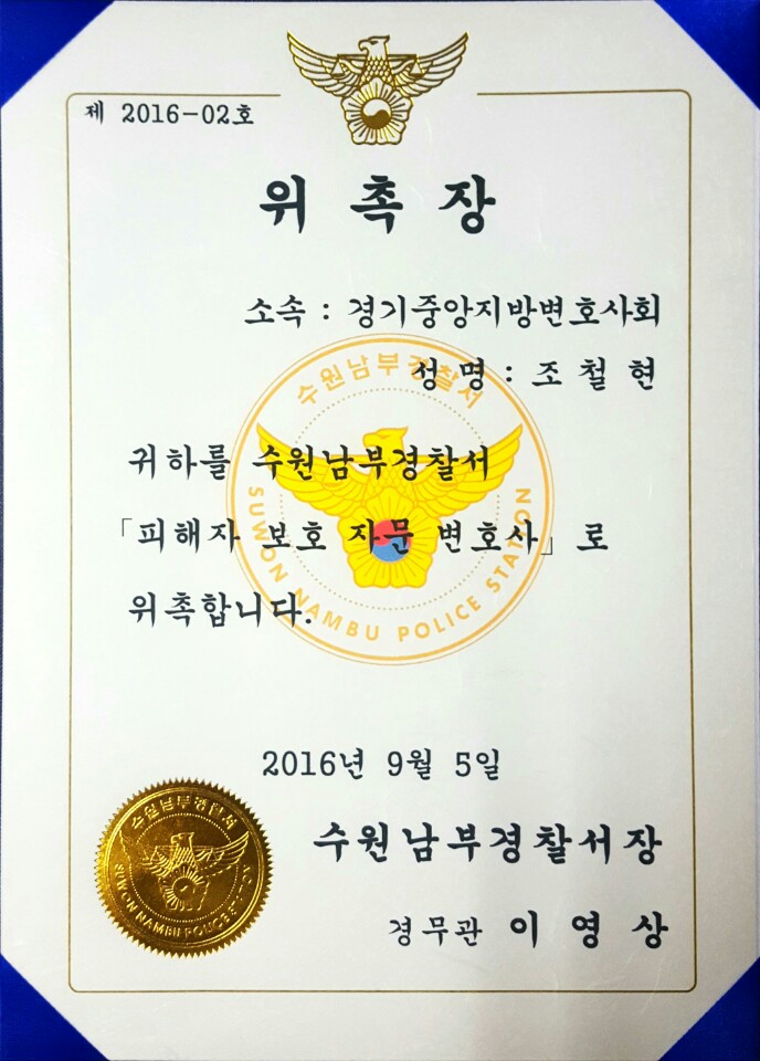 * 조철현변호사님, 수원남부경찰서 피해자보호자문변호사로 위촉 2016-10-26 법률사무소의 조철현 변호사님이 이번에 수원남부경찰서의 '피해자보호자문변호사'로 위촉되셨습니다. 조철현 변호사님은 이번 업무를 계기로 수원남부경찰서와 더욱 긴밀한 협조를 이어갈 것이고, 어려운 처지에 있는 형사 피해자들에게 형사 뿐만 아니라 민사적인 부분에 대한 법률적 자문을 아끼지 않을 것을 다짐하셨습니다. 이전글 * 고운 가사팀, 대한변호사협회에서 주최하는 가사법 특별연수 참가 다음글 * 이경렬변호사님, 수원지방법원에서 개최하는 국선보조인간담회 초청참석 목록 보기