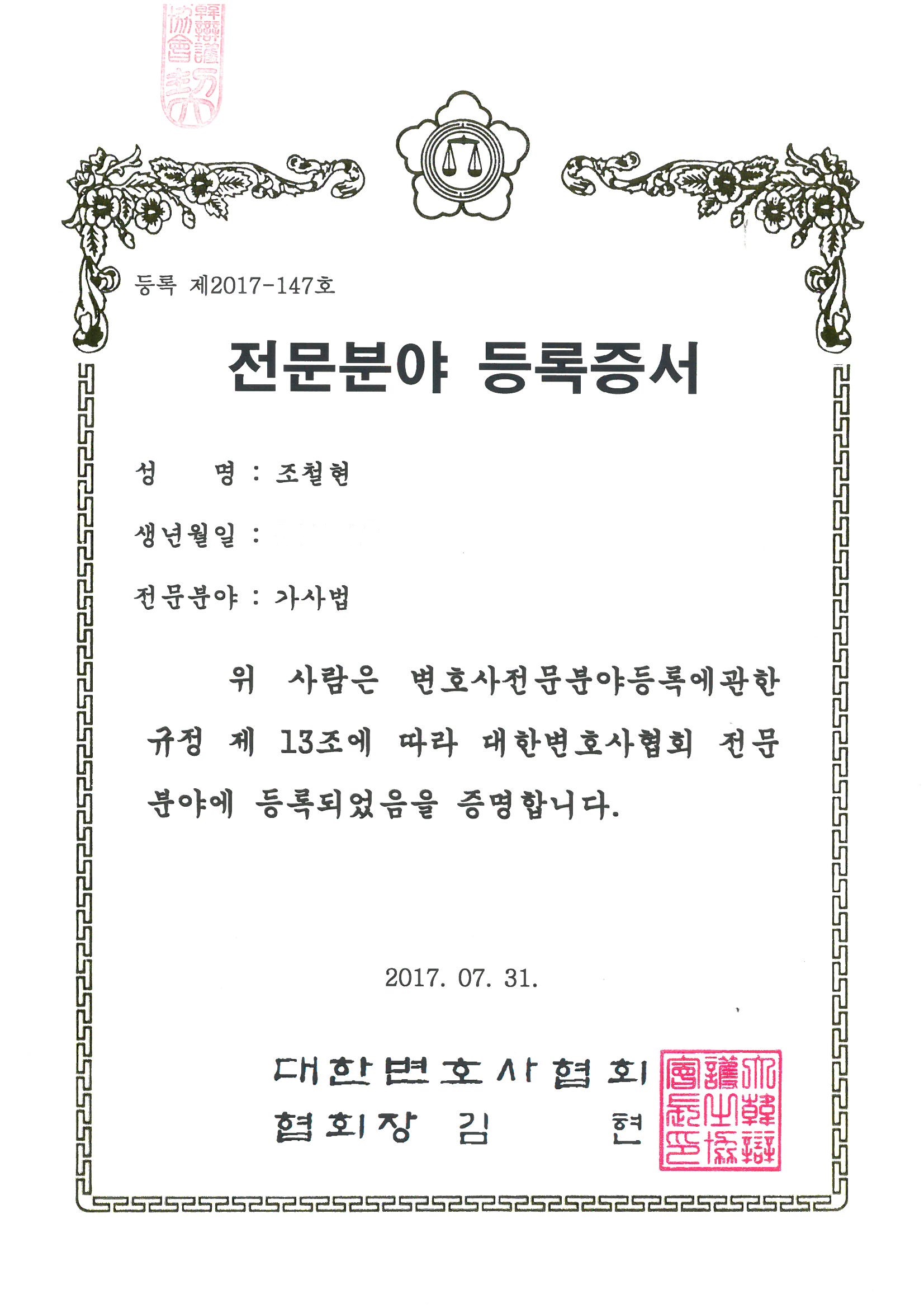 * 조철현변호사님, 대한변호사협회 인정 가사법전문변호사 등록