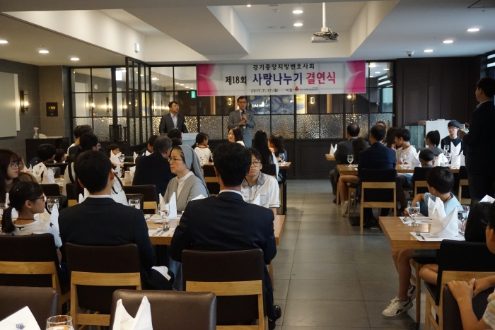 경기중앙지방변호사회는 7월 17일 (월) 오후 6시30분 부터 라메르아이에서 '제18회 사랑나누기 결연식'을 개최하였습니다. 사랑나누기 결연식은 매월 일정한 생활비를 지원하는 어려운 학생들과 결연맺은 변호사들이 한자리에 모여 식사와 담소를 나누며 즐거운 시간을 보내는 행사입니다.