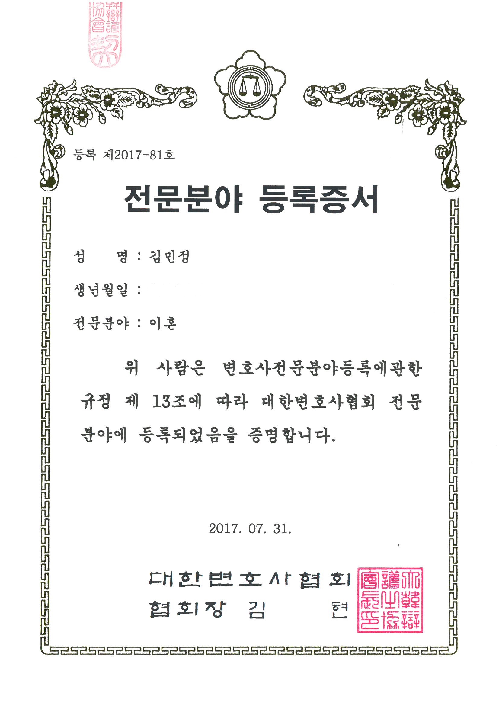 김민정변호사님이 대한변호사협회 전문분야등록 심사위원회의 심의를 거쳐 이혼 전문변호사로 인정받았고, 이에 따라 대한변호사협회에 ‘이혼’을 전문분야로 등록하였습니다.