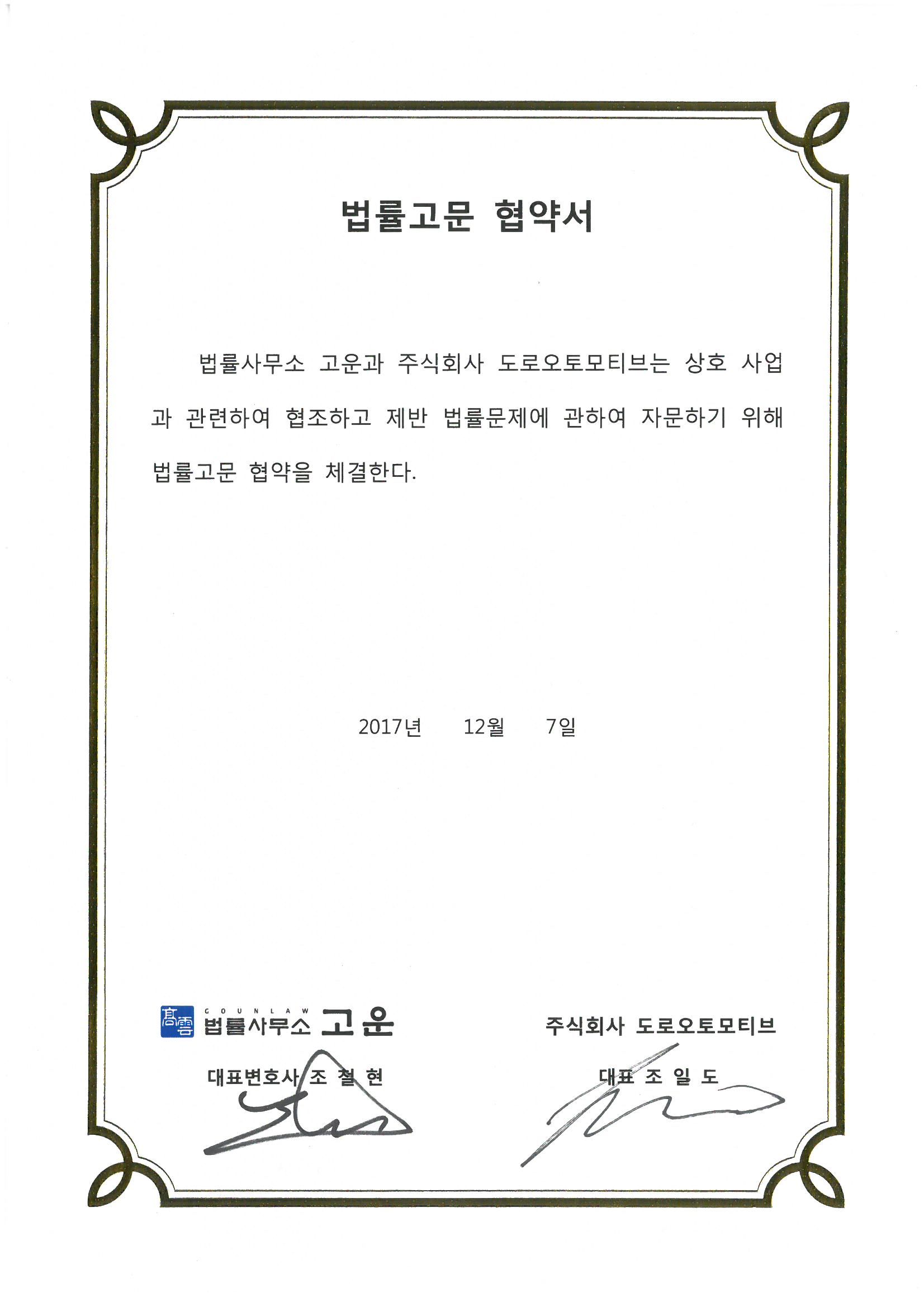 * 법률사무소 고운 법률고문협약체결(도로오토모티브) 2017-12-11 법률사무소 고운은 이번에 주식회사 도로오토모티브와 '법률고문협약'을 체결하였습니다. 법률사무소 고운은 이번 법률고문협약을 통해 주식회사 도로오토모티브와 더욱 긴밀한 협조를 이어갈 것이고, 회사에서 발생하는 여러 법률문제의 해결을 위해 법률적 자문을 아끼지 않을 것을 다짐하였습니다. 이전글 * 이경렬변호사님, 대한변호사협회 주관 회계,세무과정 수료 다음글 * 법률사무소 고운 법률고문협약체결(아즈텍코리아) 목록 보기