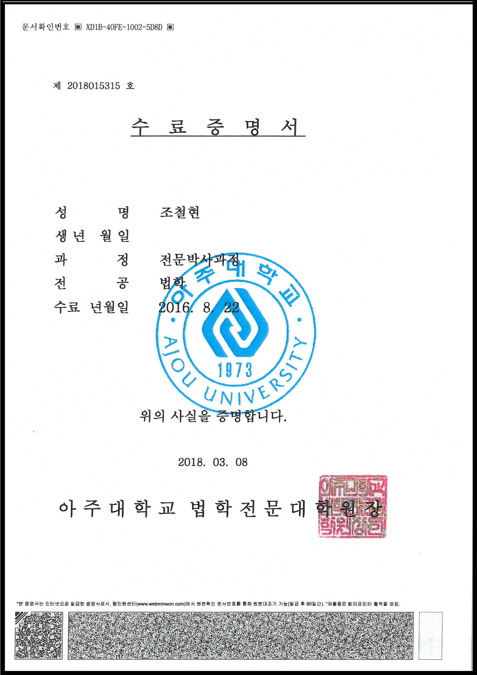 * 조철현변호사님, 형사분야 전문박사 수료 2018-03-20 법률사무소 고운의 조철현 변호사님이 형사분야 최고수준의 법률서비스를 제공하기 위하여 많은 노력 끝에 형사법 전문박사과정을 모두 마치고 수료증을 받게 되었습니다. 법률사무소 고운은 지속적인 연구와 실무경험을 바탕으로 최상의 법률서비스를 제공할 수 있도록 노력하겠습니다. 이전글 * 아주대학교 법학전문대학원 고운상 수상식 다음글 * 박지현변호사님, mbc뉴스 미성년자성추행 사건에 관련 인터뷰 진행 목록 보기
