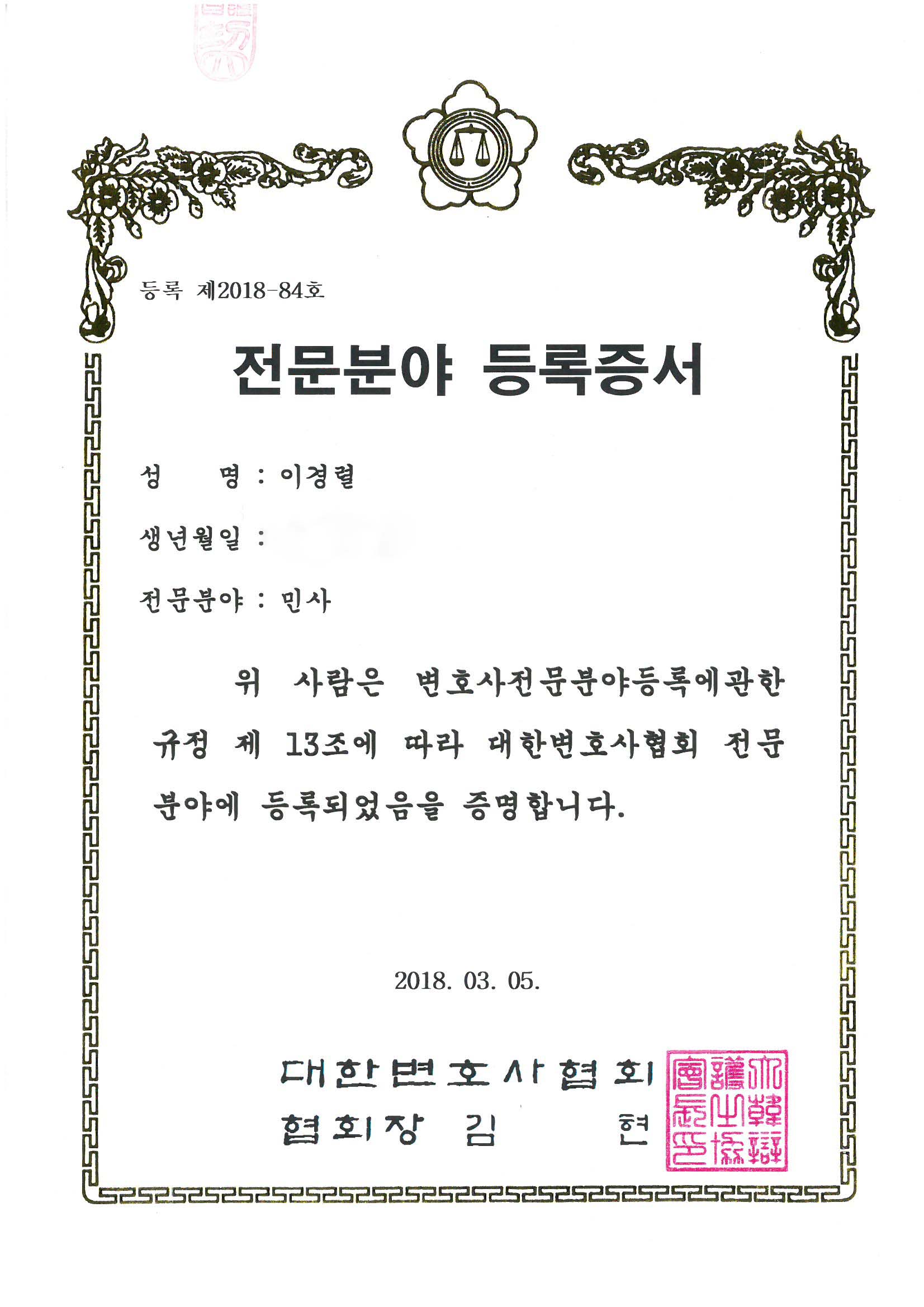 * 이경렬변호사님, 대한변호사협회 인정 민사전문변호사 등록