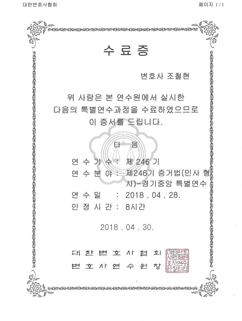 * 조철현변호사님, 대한변호사협회 주관 증거법 특별연수 수료