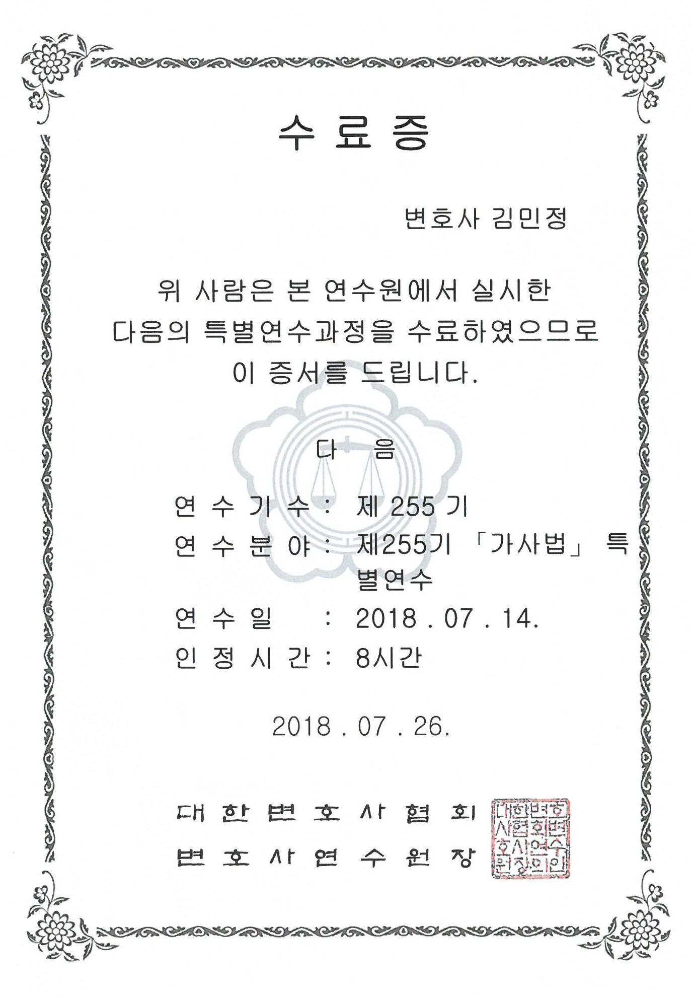 * 김민정변호사님, 대한변호사협회 가사법 특변연수과정 수료