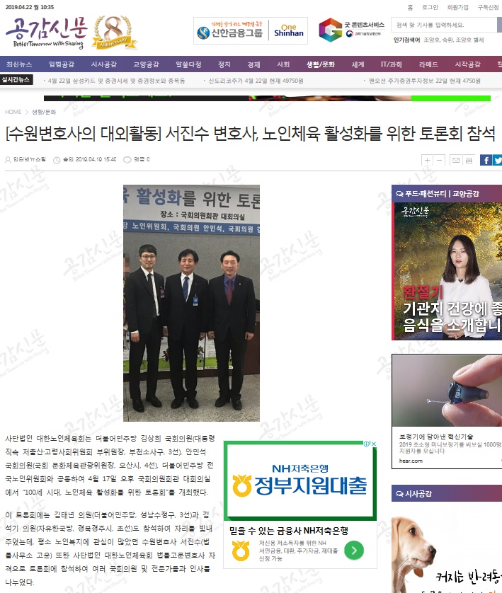 서진수변호사님은 대한노인체육회 법률고문변호사 자격으로 2019. 4. 17. 국회의원회관 대회의실에서 개최된 “100세 시대 노인체육 활성화를 위한 토론회”에 참석을 하였습니다.