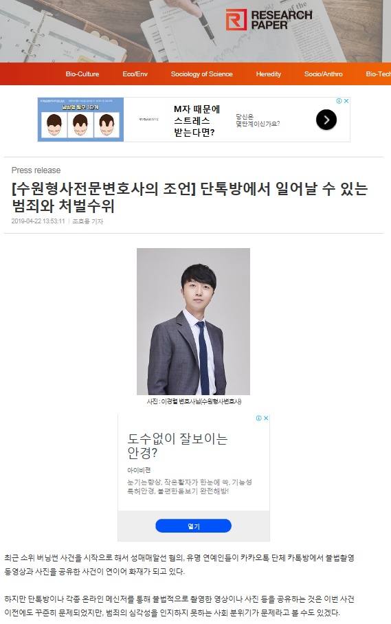 * 이경렬변호사님, 리서치페이퍼에 “단톡방에서 일어날 수 있는 범죄와 처벌수위”로 게재