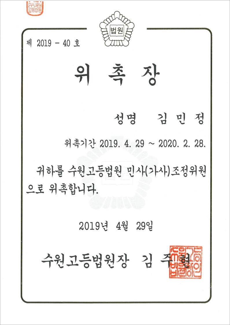 법률사무소 고운의 김민정변호사님은 2019. 4. 29.부터 2020. 2. 28.까지 수원고등법원 가사 조정위원으로 위촉되었습니다.
