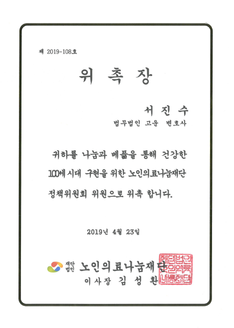 법률사무소 고운의 서진수변호사님은 2019. 4. 23. 노인의료나눔재단 정책위원회 정책위원으로 위촉되었습니다.