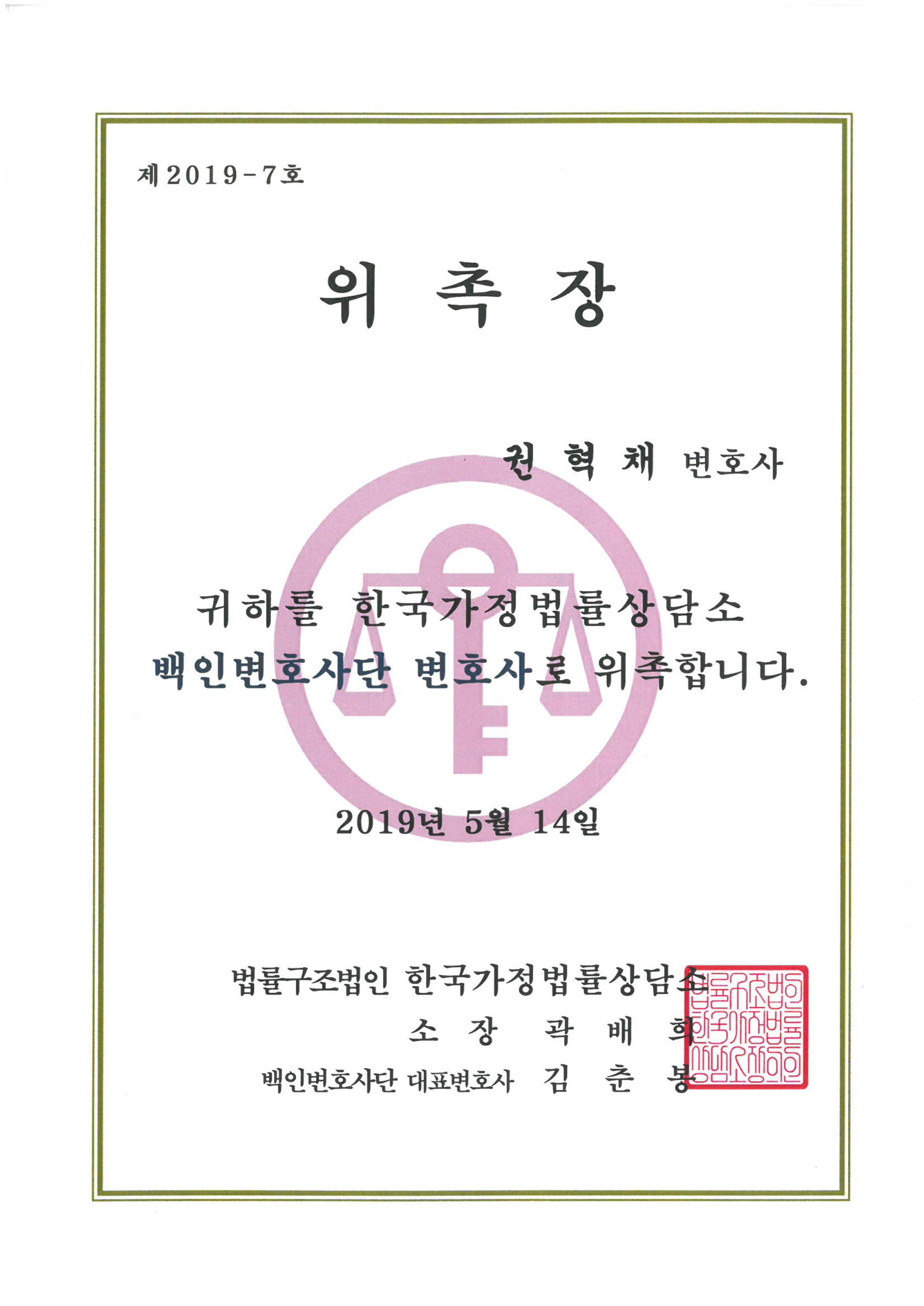 법률사무소 고운의 권혁채변호사님은 2019. 5. 14. 법률구조법인 한국가정법률상담소 100인변호사단 변호사로 위촉되었습니다.100인변호사단은 한국가정법률상담소가 전국에 계신 변호사님들 중 가족법과 관련하여 전문성을 가지고 계신 변호사님들을 특별히 선정하여 임명하는 것으로, 본인과 법률사무소 고운에 큰 영광이라고 생각됩니다.