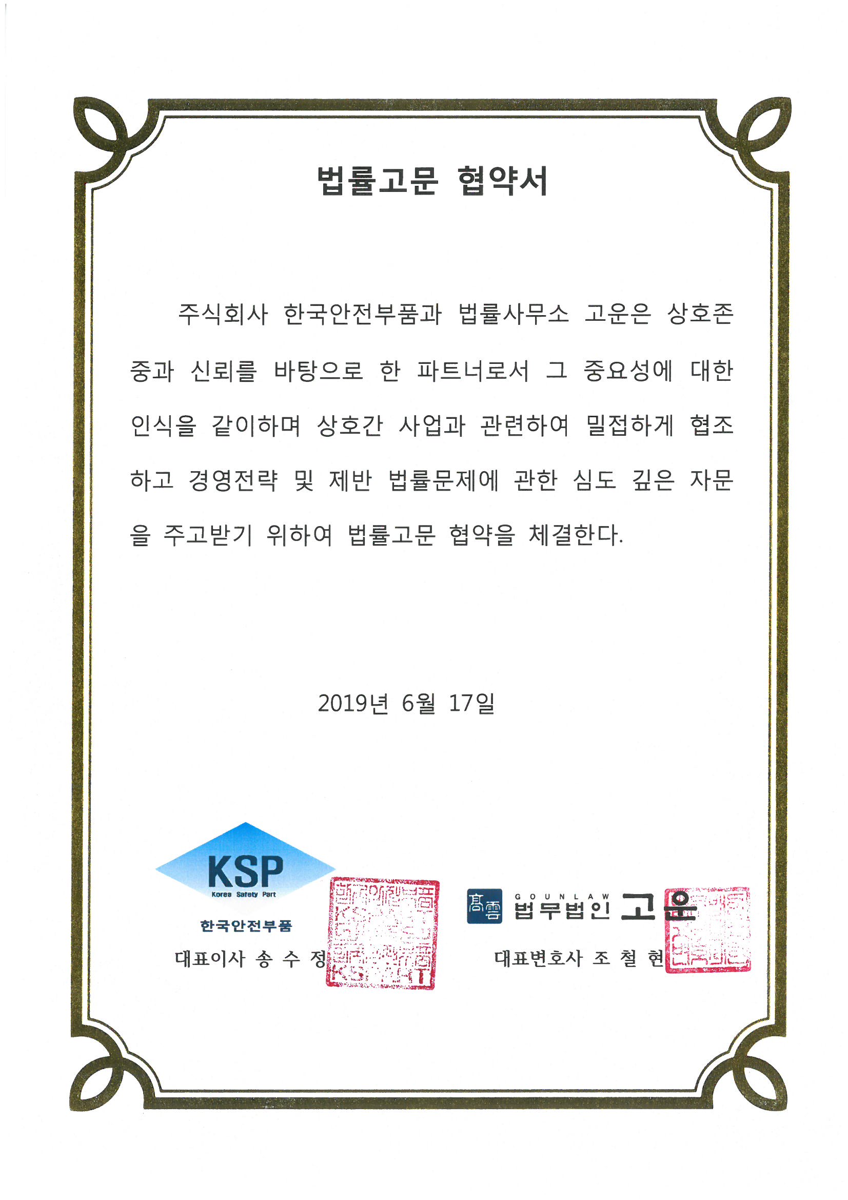 법무법인 고운은 2019년 6월17일 주식회사 한국안전부품과 법률고문협약을 체결하였습니다.