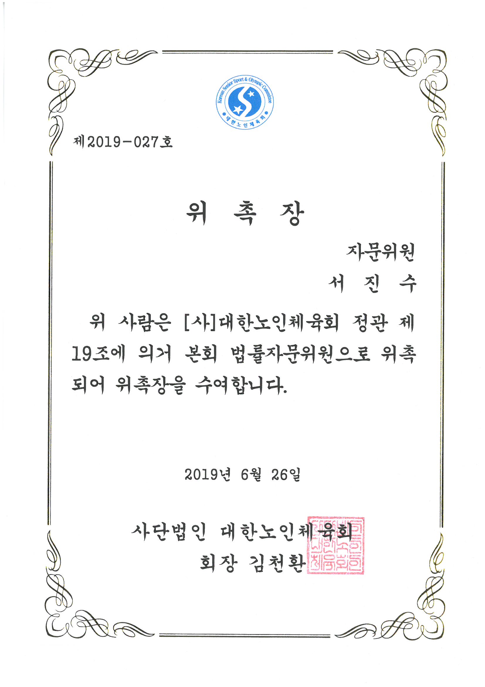 * 서진수변호사님, 사단법인 대한노인체육회 법률자문위원으로 위촉