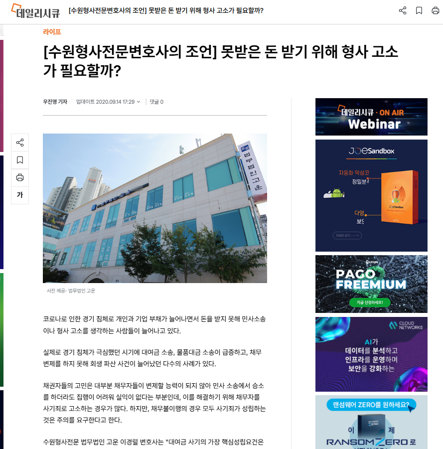 * 데일리시큐에 “못받은 돈 받기 위해 형사 고소가 필요할까?”로 기사 게재