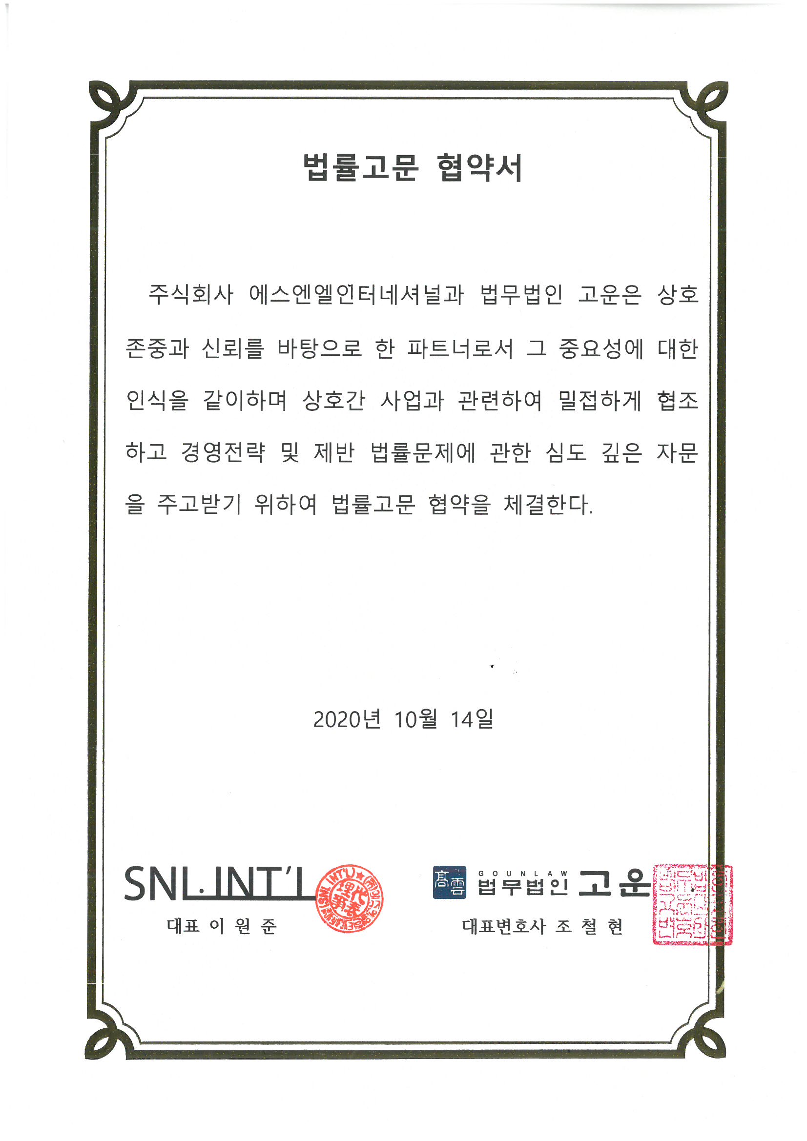 법무법인 고운은 2020.10.14. 주식회사 에스엔엘인터네셔널과 법률고문협약을 체결하였습니다.