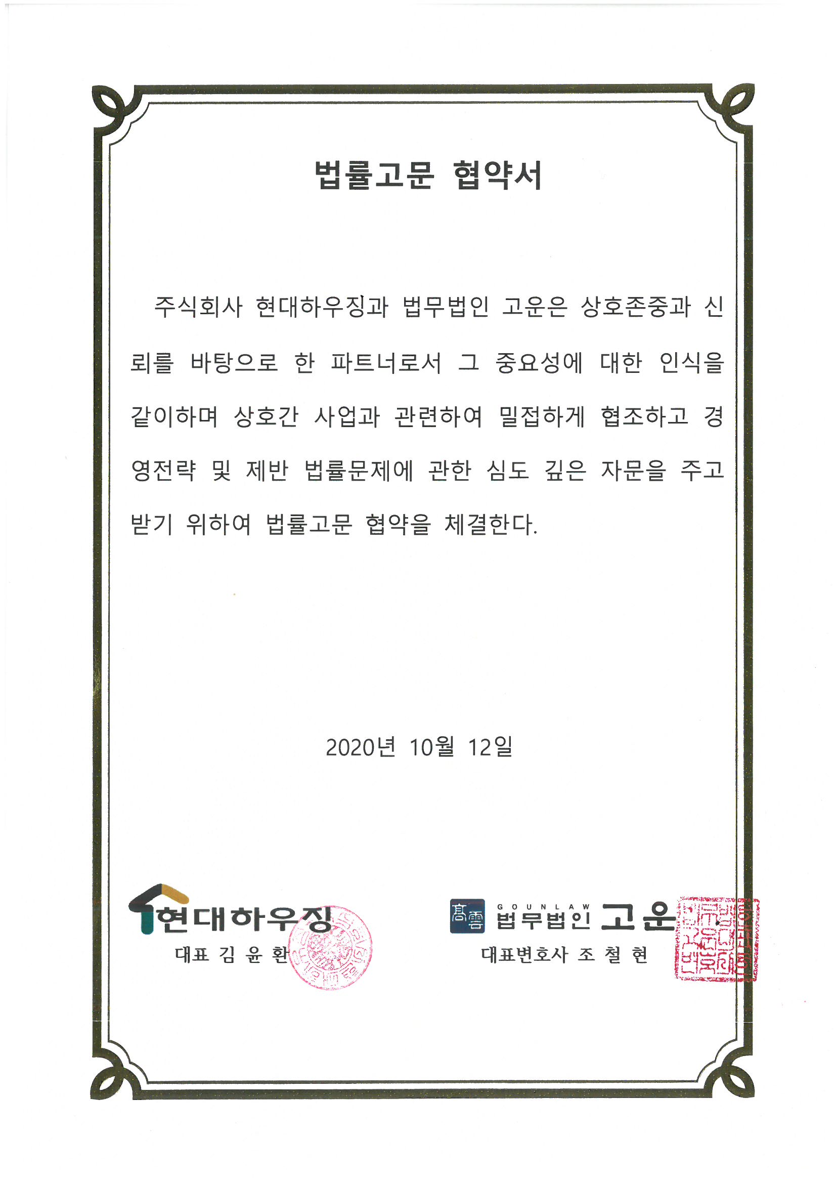 법무법인 고운은 2020.10.12. 주식회사 현대하우징과 법률고문협약을 체결하였습니다.
