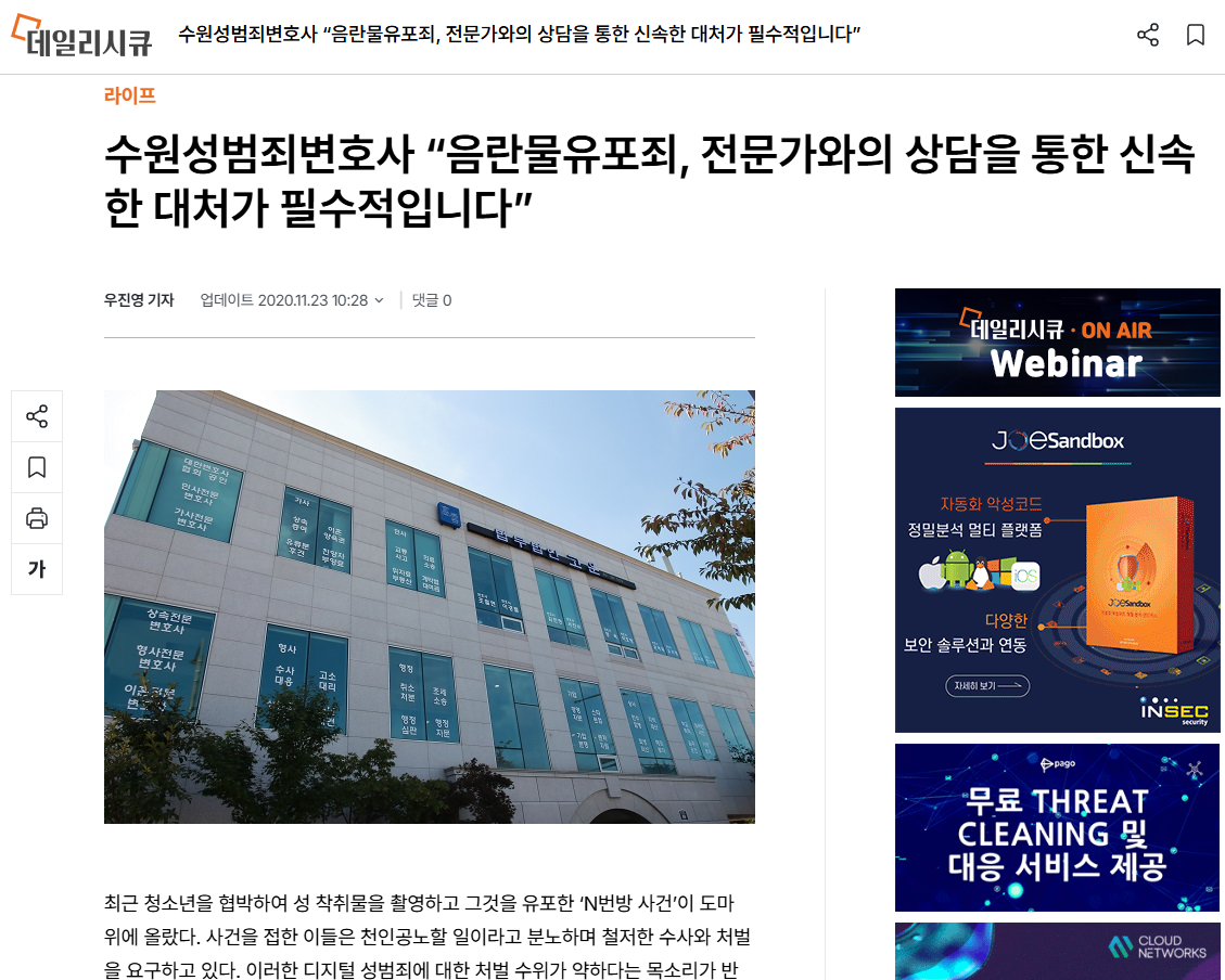 * “음란물유포죄, 전문가와의 상담을 통한 신속한 대처 필수”로 언론보도