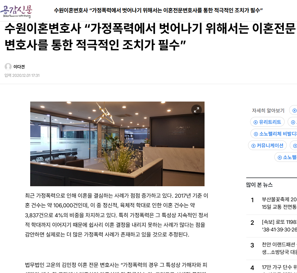 법무법인 고운의 가사팀 팀장이신 김민정변호사님이 공감신문에 “수원이혼변호사, 가정폭력에서 벗어나기 위해서는 이혼전문변호사를 통한 적극적인 조치가 필수”로 게재되었습니다.