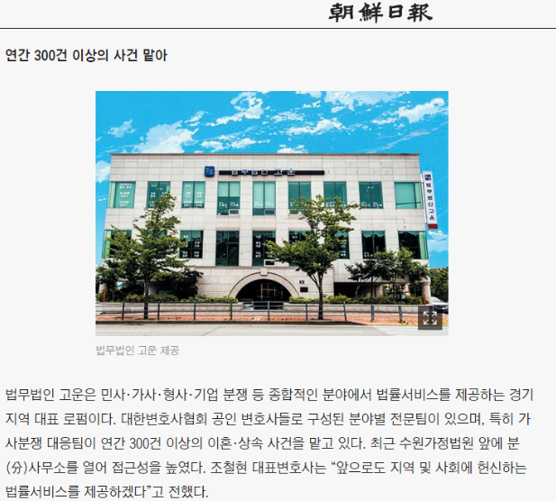 조선일보에 “법무법인 고운은 민사·가사·형사·기업 분쟁 등 종합적인 분야에서 법률서비스를 제공하는 경기지역 대표 로펌이다. 대한변호사협회 공인 변호사들로 구성된 분야별 전문팀이 있으며, 특히 가사분쟁 대응팀이 연간 300건 이상의 이혼·상속 사건을 맡고 있다. 최근 수원가정법원 앞에 분(分)사무소를 열어 접근성을 높였다.”로 소개되었습니다.