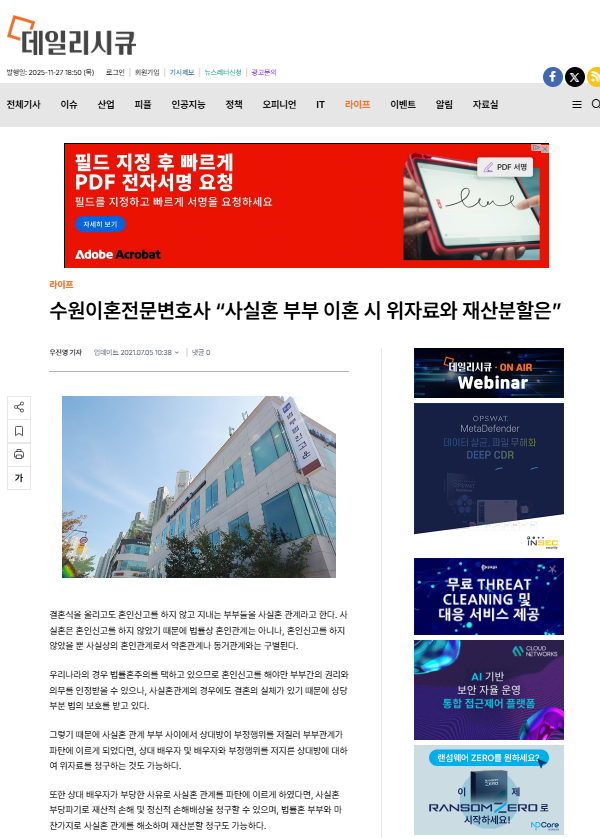 * 데일리시큐에 “수원이혼전문변호사, 사실혼 부부 이혼 시 위자료와 재산분할은”으로 게재