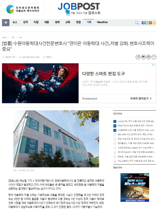 * 잡포스트에 "연이은 아동학대 사건...처벌 강화, 변호사조력이 중요"로 게재