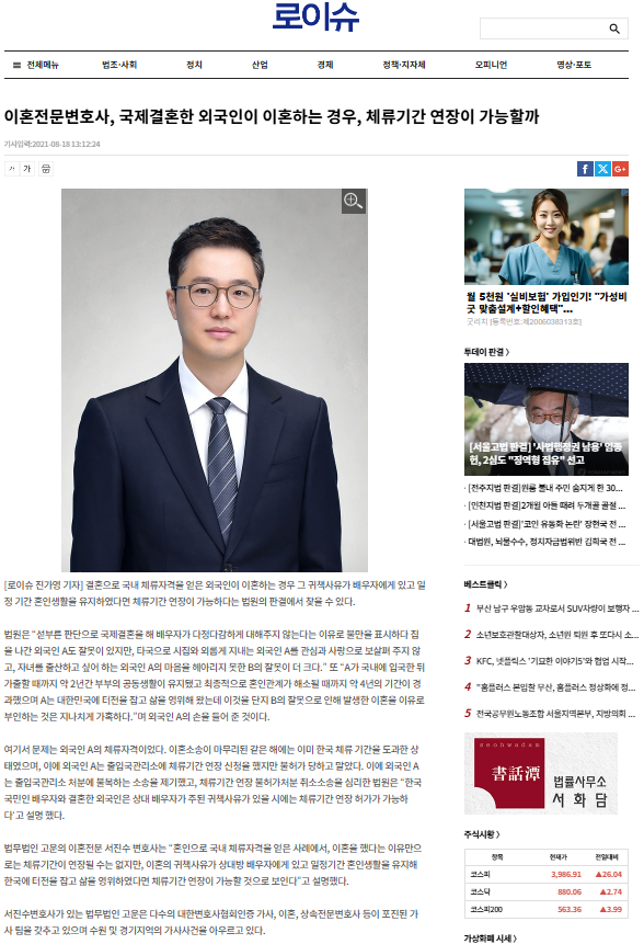법무법인 고운의 서진수변호사님이 로이슈에 “이혼전문변호사, 국제결혼한 외국인이 이혼하는 경우 체류기간 연장이 가능할까”로 게재되었습니다.