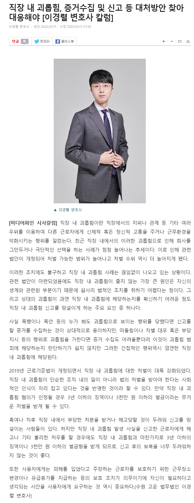 * 미디어파인에 ‘직장 내 괴롭힘, 증거수집 및 신고 등 대처방안 찾아 대응해야’ 이라는 주제로 언론보도