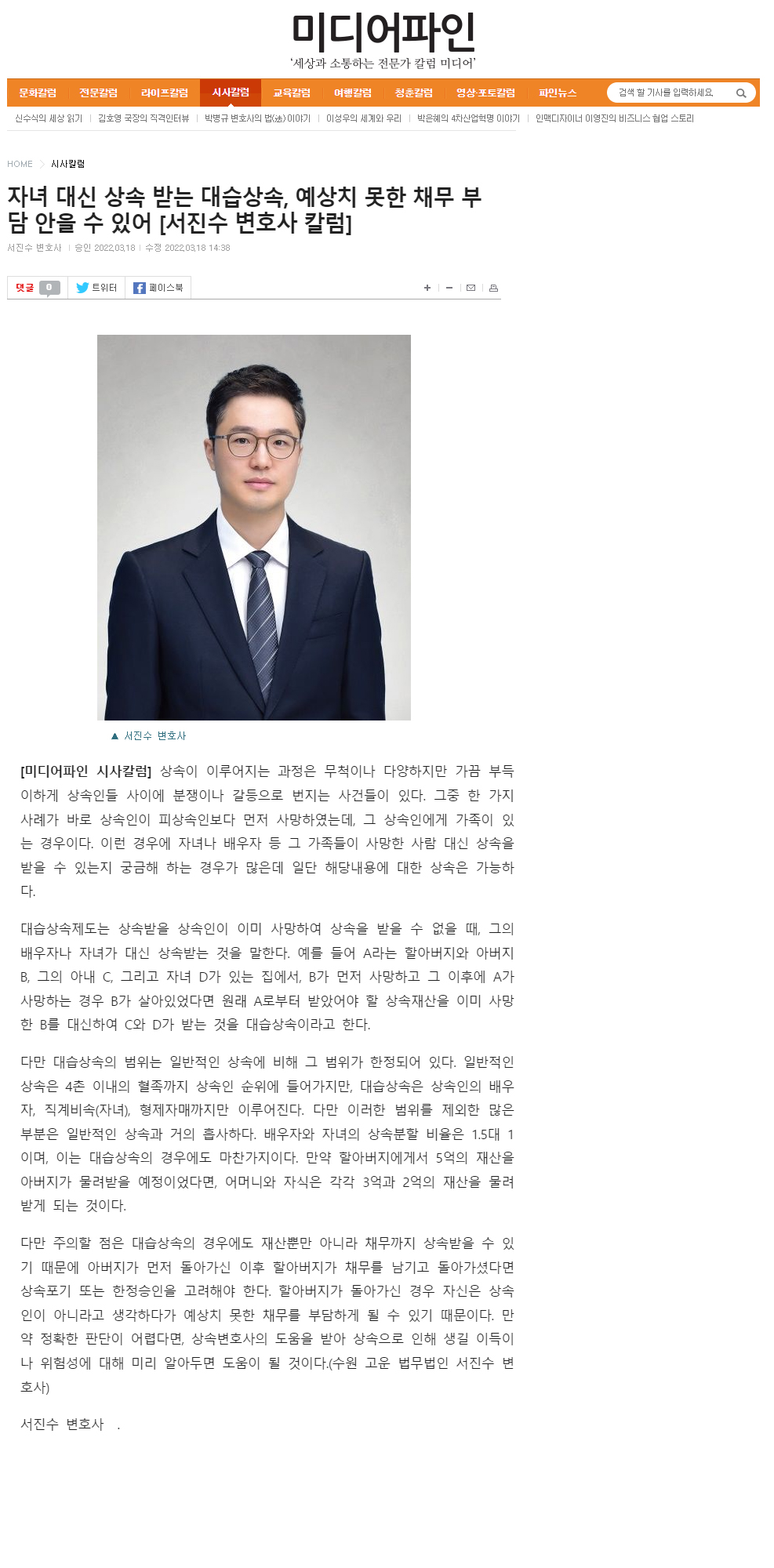 법무법인 고운의 서진수 변호사님께서 미디어파인에 ‘자녀 대신 상속 받는 대습상속, 예상치 못한 채무 부담 안을 수 있어’라는 주제로 언론보도되었습니다.