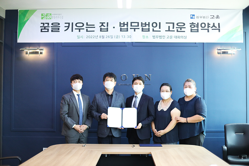 사회복지법인 [꿈을 키우는 집]은 단순히 아이들을 보호하는 곳이 아닌, 가정과 흡사한 환경을 통해 나아가 아이들이 건전한 시민의 일원으로 육성시키는 데 목적을 가지고 있으며 법무법인 고운 역시 그 운영목적에 도움이 되고자 이번 업무협약을 진행하게 되었습니다.