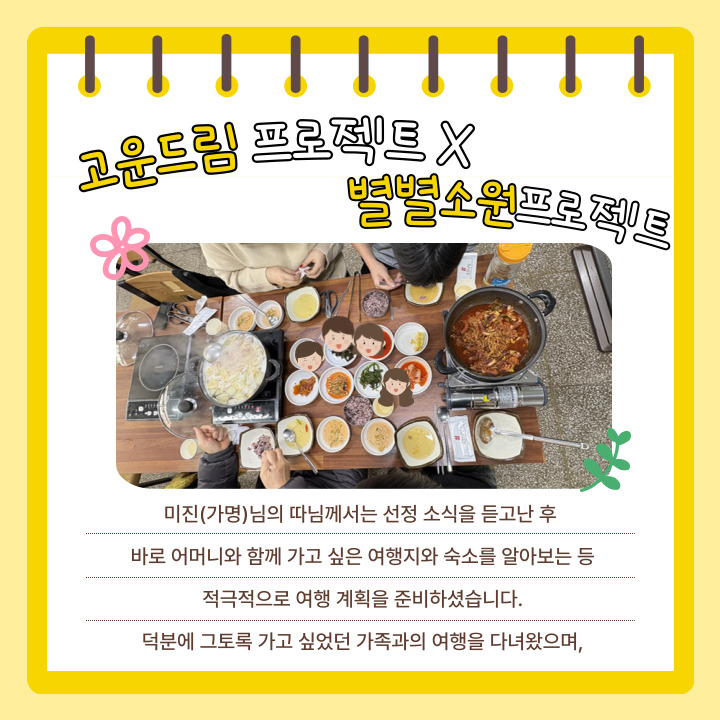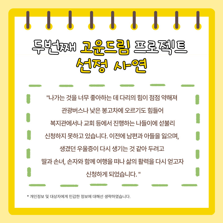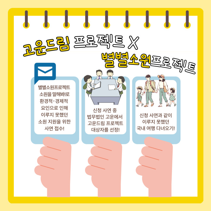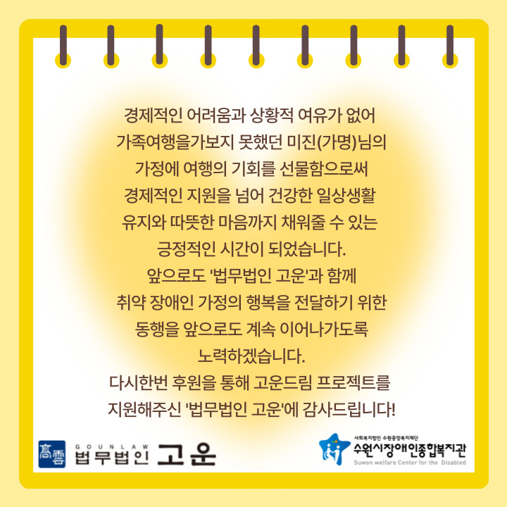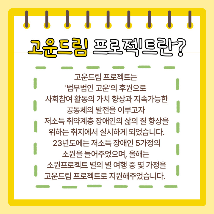 이번 고운드림프로젝트는 환경적, 경제적 요인으로 인해 가족여행을 다니지 못한 가정 중 한 가정을 선정하여 가족여행을 지원해주는 것으로 진행되었습니다.