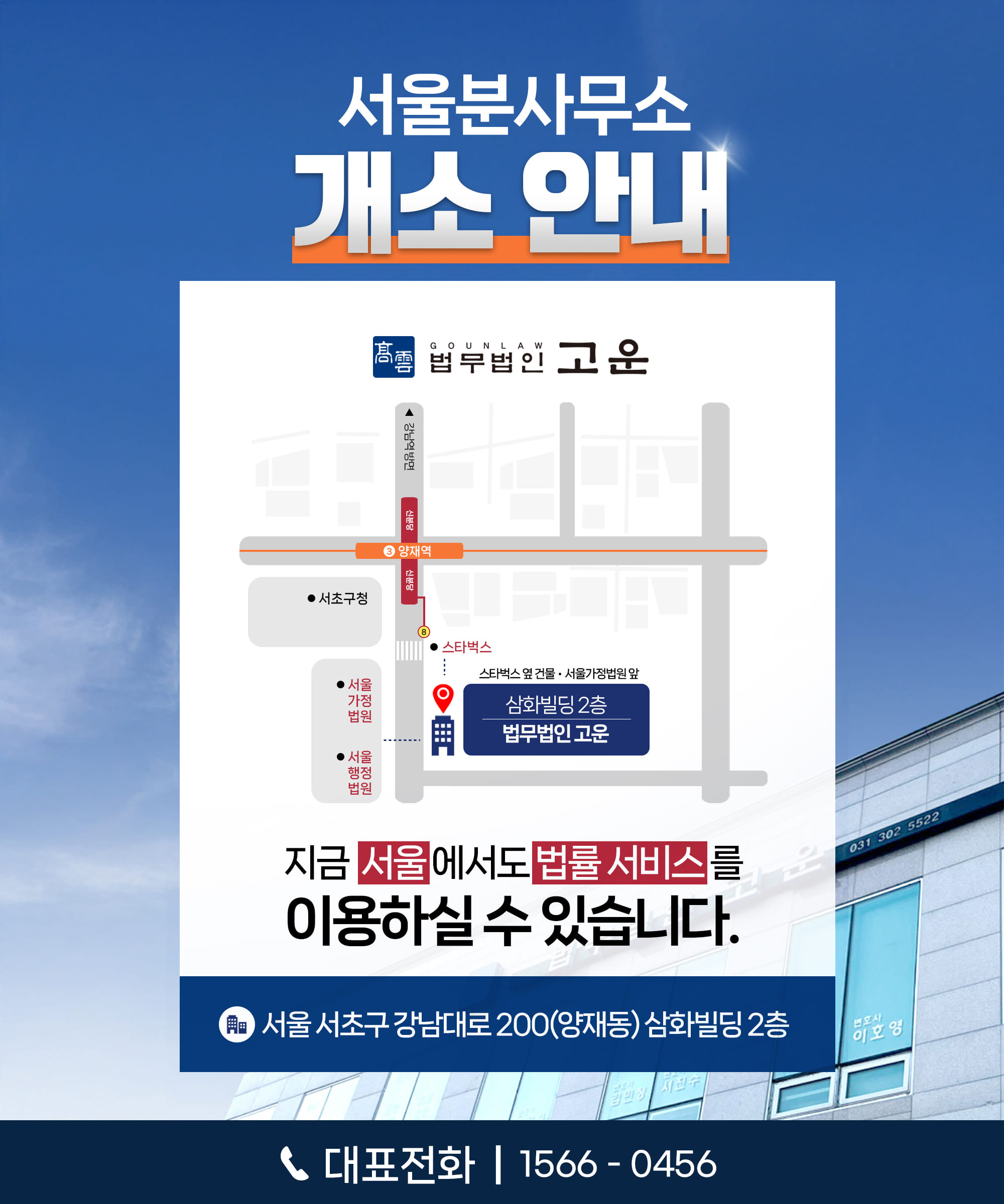 법률적 어려움으로 인해 전문 변호사와의 심층 상담을 원하시는 분은 법무법인 고운 대표번호 1566-0456을 통해 예약 후 방문해주시길 바랍니다.