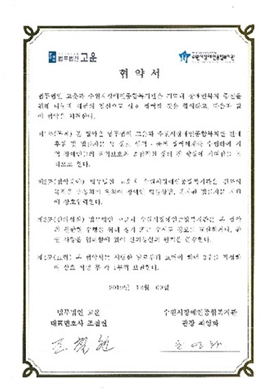 법무법인 고운은 지역 장애인의 권익 보호와 안정적인 복지 환경 조성을 위해 수원시장애인종합복지관과 공식 협약을 체결하고, 지속적인 법률 지원 체계를 구축해 오고 있습니다.