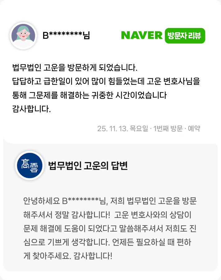 답답하고 급한일이 있어 많이 힘들었는데 고운 변호사님을 통해 해결하는 귀중한 시간이었습니다.