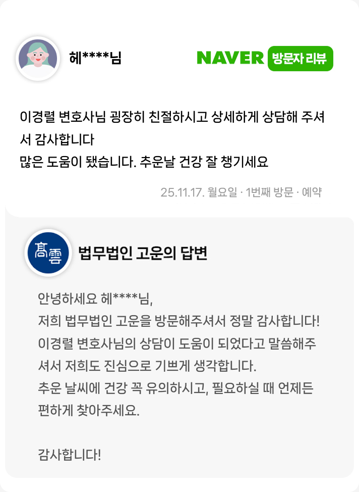 이경렬 변호사님 굉장히 친절하시고 상세하게 상담해 주셔서 감사합니다