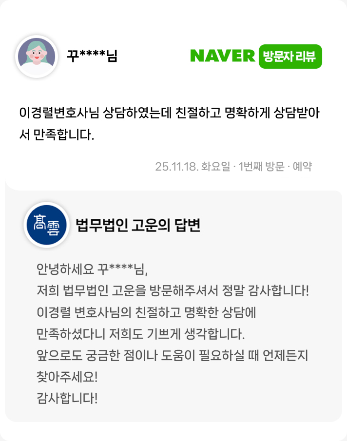 이경렬변호사님 상담하였는데 친절하고 명확하게 상담받아서 만족합니다.