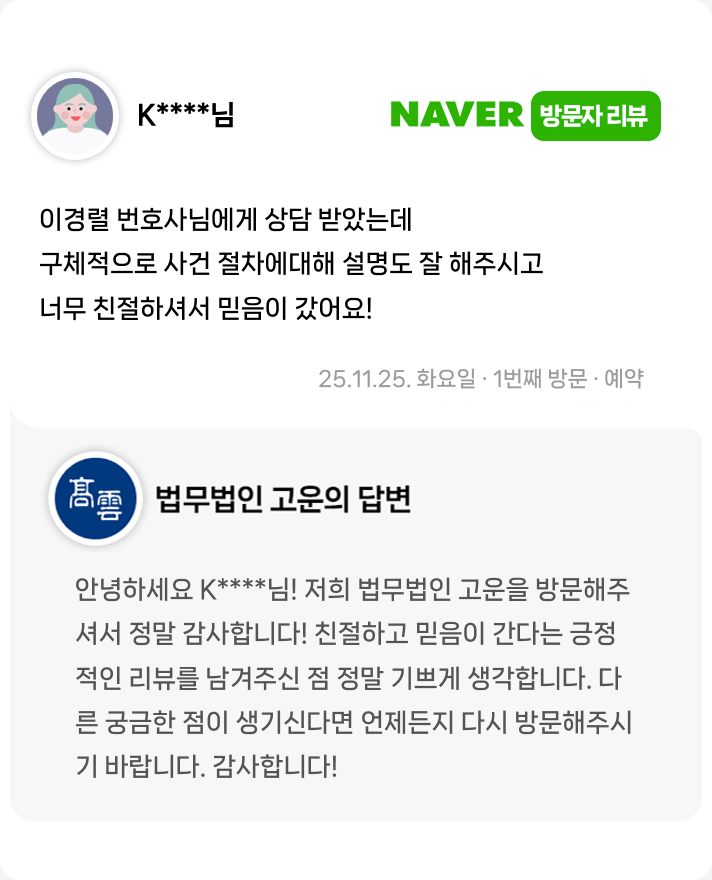 이경렬 번호사님에게 상담 받았는데 구체적으로 사건 절차에 대해 설명도 잘 해주시고 친절하셔서 믿음이 갔어요!