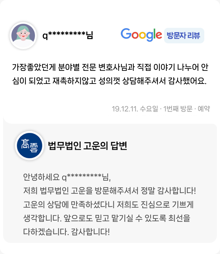 가장좋았던게 분야별 전문 변호사님과 직접 이야기 나누어 안심이 되었고 재촉하지않고 성의껏 상담해주셔서 감사했어요.