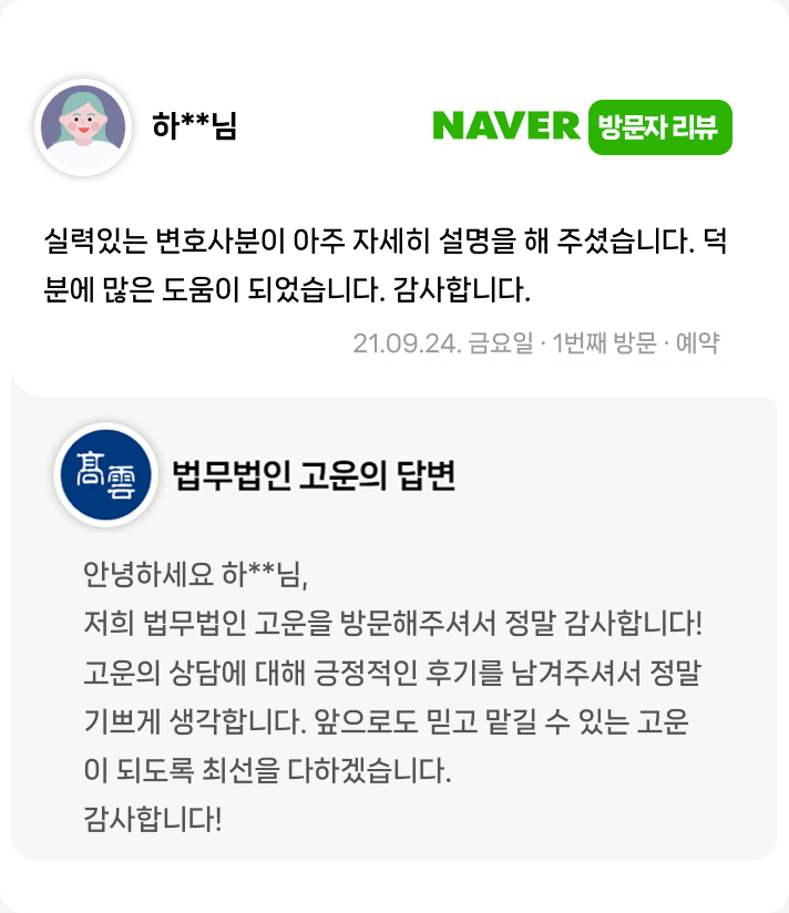 실력있는 변호사분이 아주 자세히 설명을 해 주셨습니다. 덕분에 많은 도움이 되었습니다. 감사합니다.