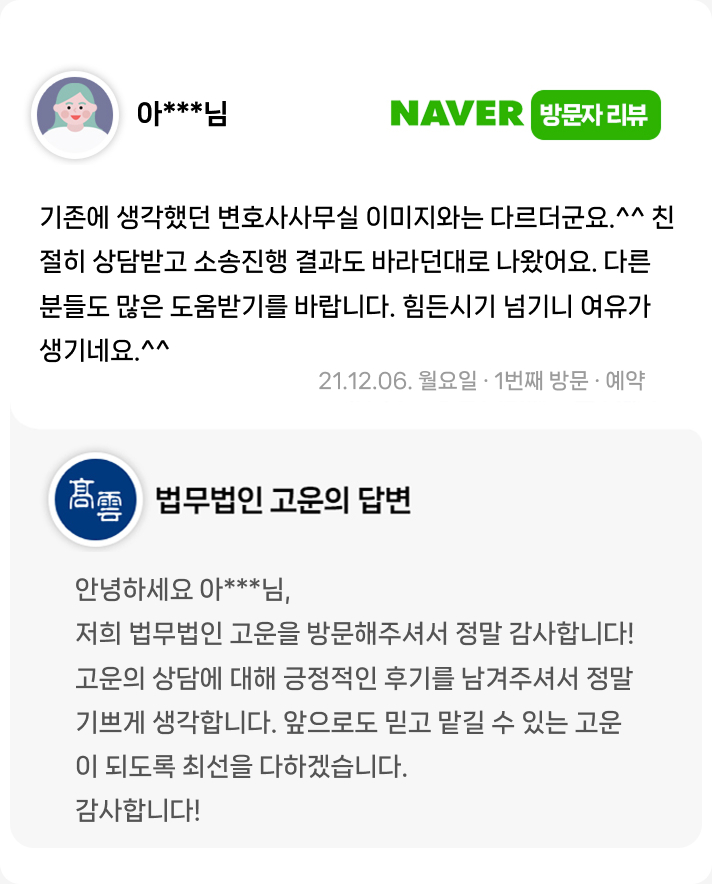 친절히 상담받고 소송진행 결과도 바라던대로 나왔어요. 다른 분들도 많은 도움받기를 바랍니다.
