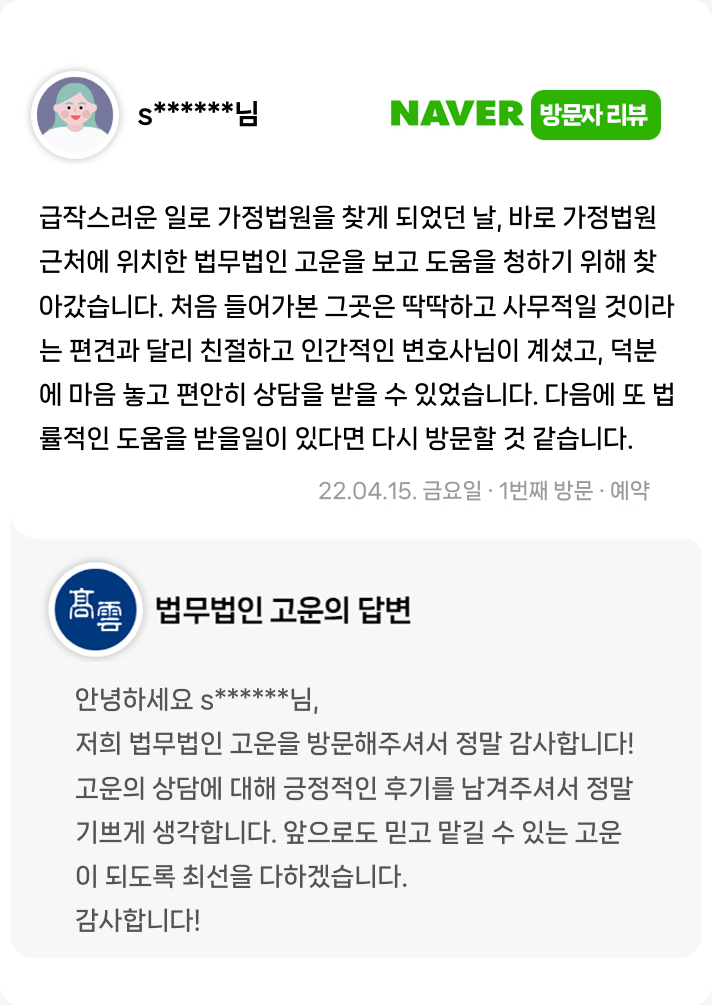사무적일 것이라는 편견과 달리 친철한 변호사님이 계셨고, 덕분에 마음 놓고 편안히 상담을 받을수 있었습니다.