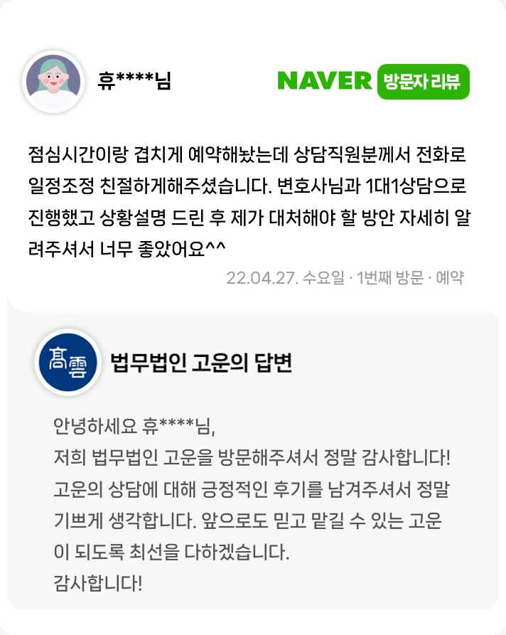 변호사님과 1대1상담으로 진행했고 상황설명 드린 후 제가 대처해야 할 방안 자세히 알려주셔서 너무 좋았어요.