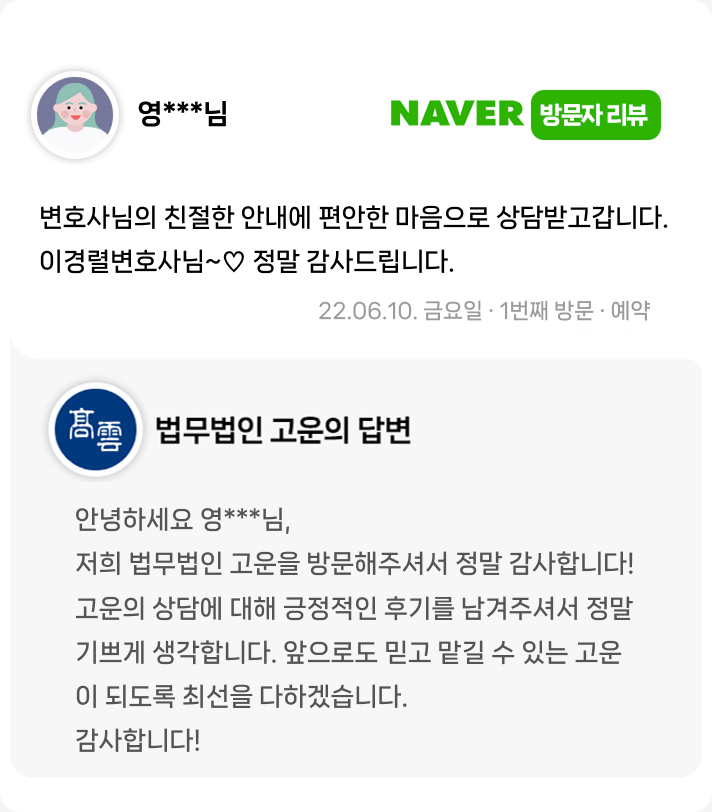 변호사님의 친절한 안내에 편안한 마음으로 상담받고갑니다. 이경렬변호사님~♡ 정말 감사드립니다.