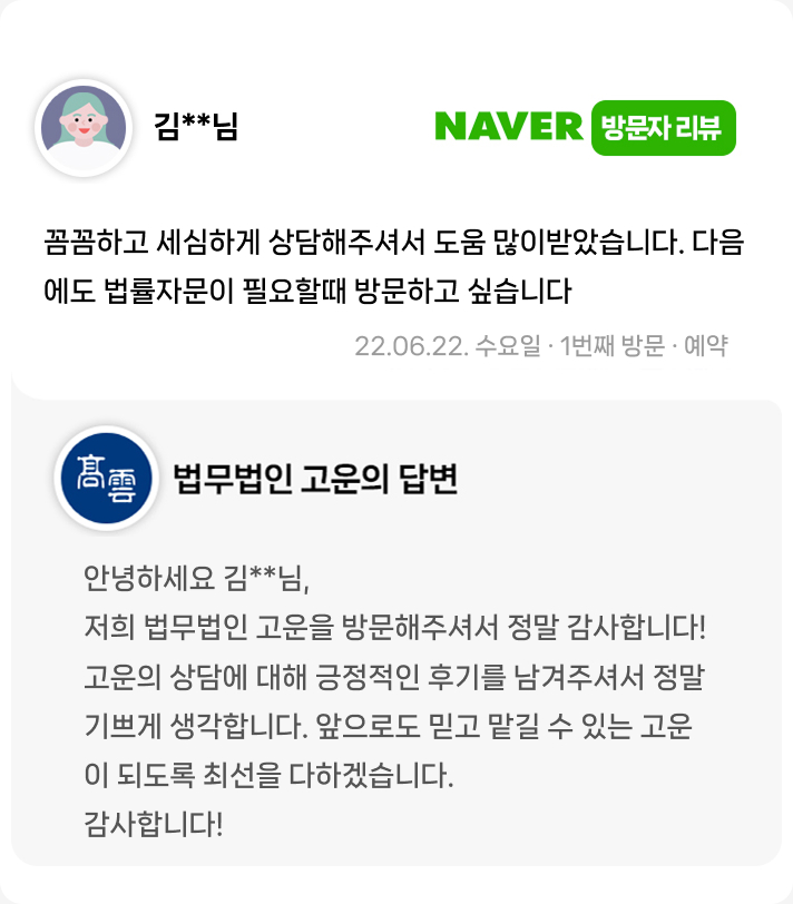 꼼꼼하고 세심하게 상담해주셔서 도움 많이받았습니다. 다음에도 법률자문이 필요할때 방문하고 싶습니다
