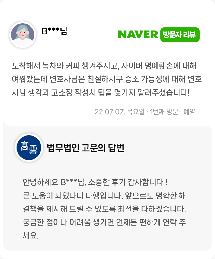사이버명예훼손 ㅣ 온라인 게시물로 인한 명예훼손 피해에 대해 형사·민사 대응 방안을 상담하기 위해 방문하신 고객님