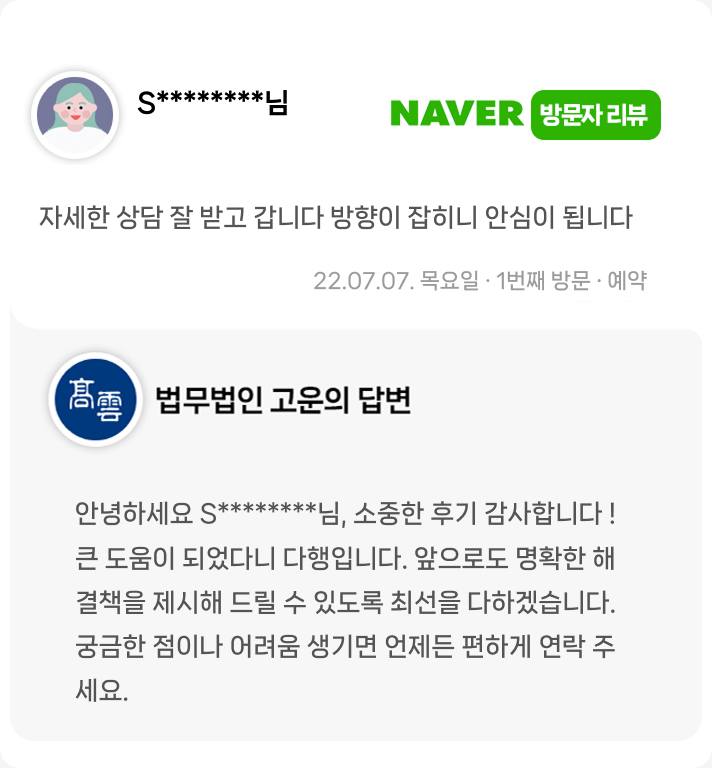 법률 상담은 얼굴을 마주하고 이야기할 때 숨겨진 사실도, 말하지 못한 감정도 함께 풀어낼 수 있습니다. 당신의 이야기를 제대로 듣기 위해 고운은 방문 상담을 원칙으로 합니다 홈페이지에서 편하게 예약하실 수 있습니다.