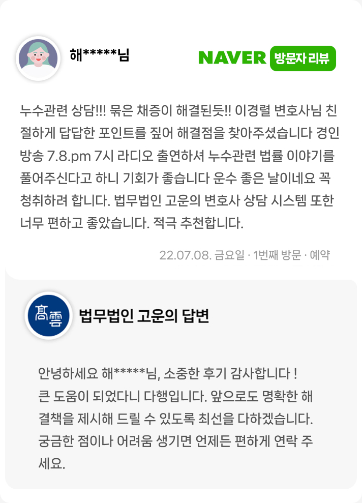 이경렬 변호사님 친절하게 답답한 포인트를 짚어 해결점을 찾아주셨습니다. 적극 추천합니다.
