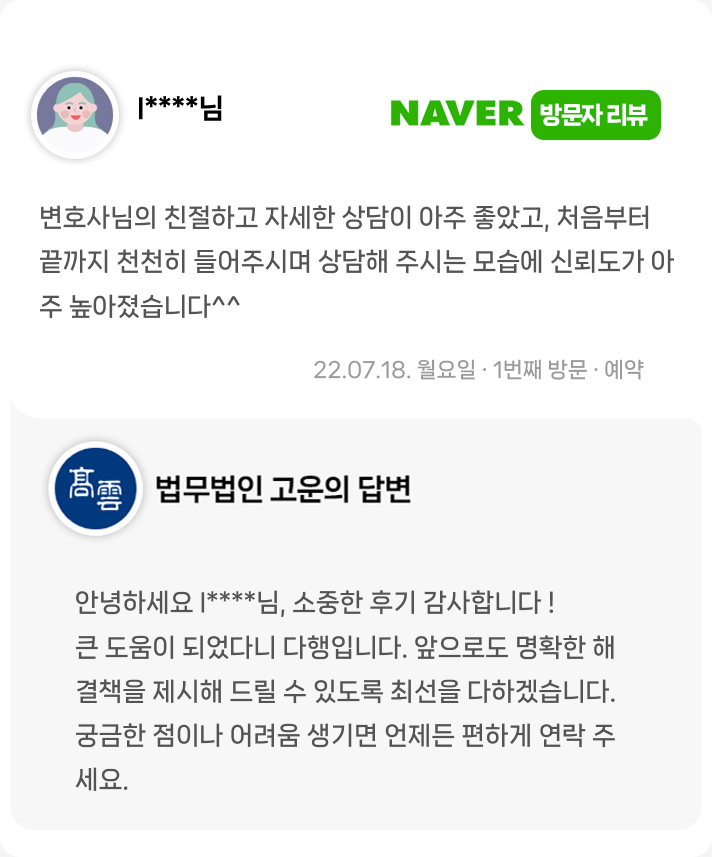 처음부터 끝까지 천천히 들어주시며 상담해 주시는 모습에 신뢰도가 아주 높아졌습니다.
