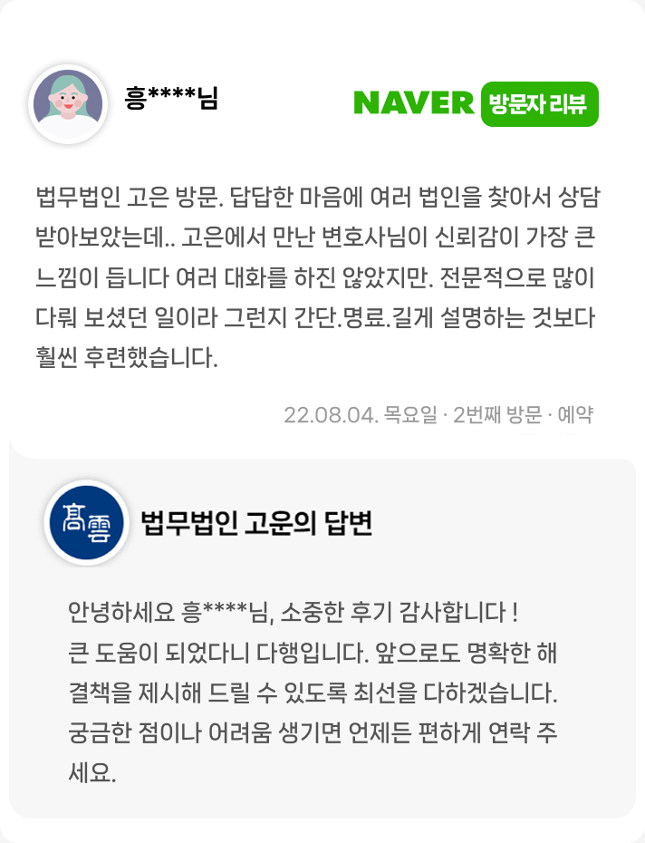 법률 상담은 얼굴을 마주하고 이야기할 때 숨겨진 사실도, 말하지 못한 감정도 함께 풀어낼 수 있습니다. 당신의 이야기를 제대로 듣기 위해 고운은 방문 상담을 원칙으로 합니다 홈페이지에서 편하게 예약하실 수 있습니다.